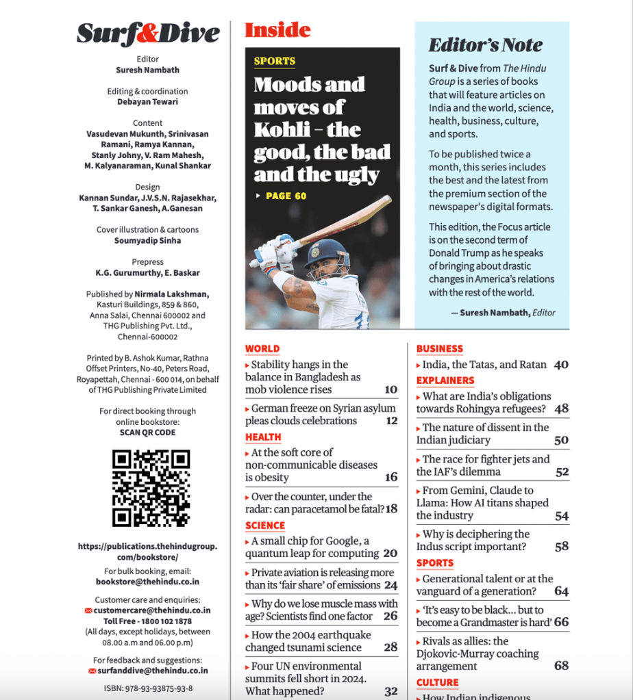 The Hindu has a new print product out called ‘Surf & Dive’ (S&D), whose first edition the editor Suresh Nambath and MP Shashi Tharoor launched at the group’s ‘Lit for Life’ event in Chennai on January 18. We’ve been working on this for quite some time and are thrilled it’s finally out. S&D will be fortnightly with 76 pages, priced fully — without any part of it being paid for by ads — at Rs 99 per edition. It will present long-form reads on a variety of topics. Each edition will also feature a special cover story: the first one is an extensive analysis of what the world can expect during Trump 2.0.